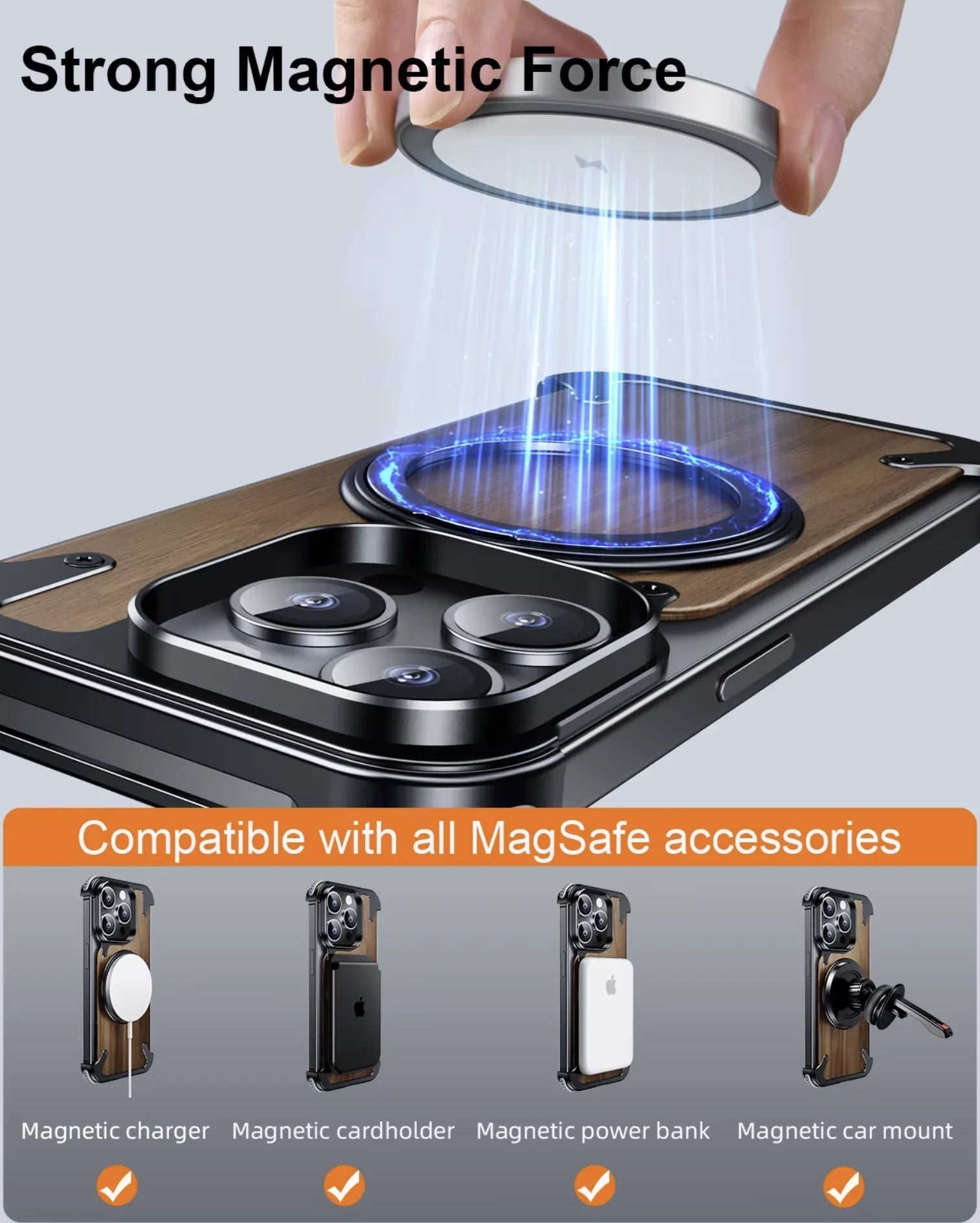 The Rustic Solid Wood Metal MagSafe Case combines the durability of solid wood with the strength of metal to create a phone case that's both stylish and robust. This case features a unique design, with a MagSafe-compatible structure that allows for easy wireless charging and secure attachment of MagSafe accessories.